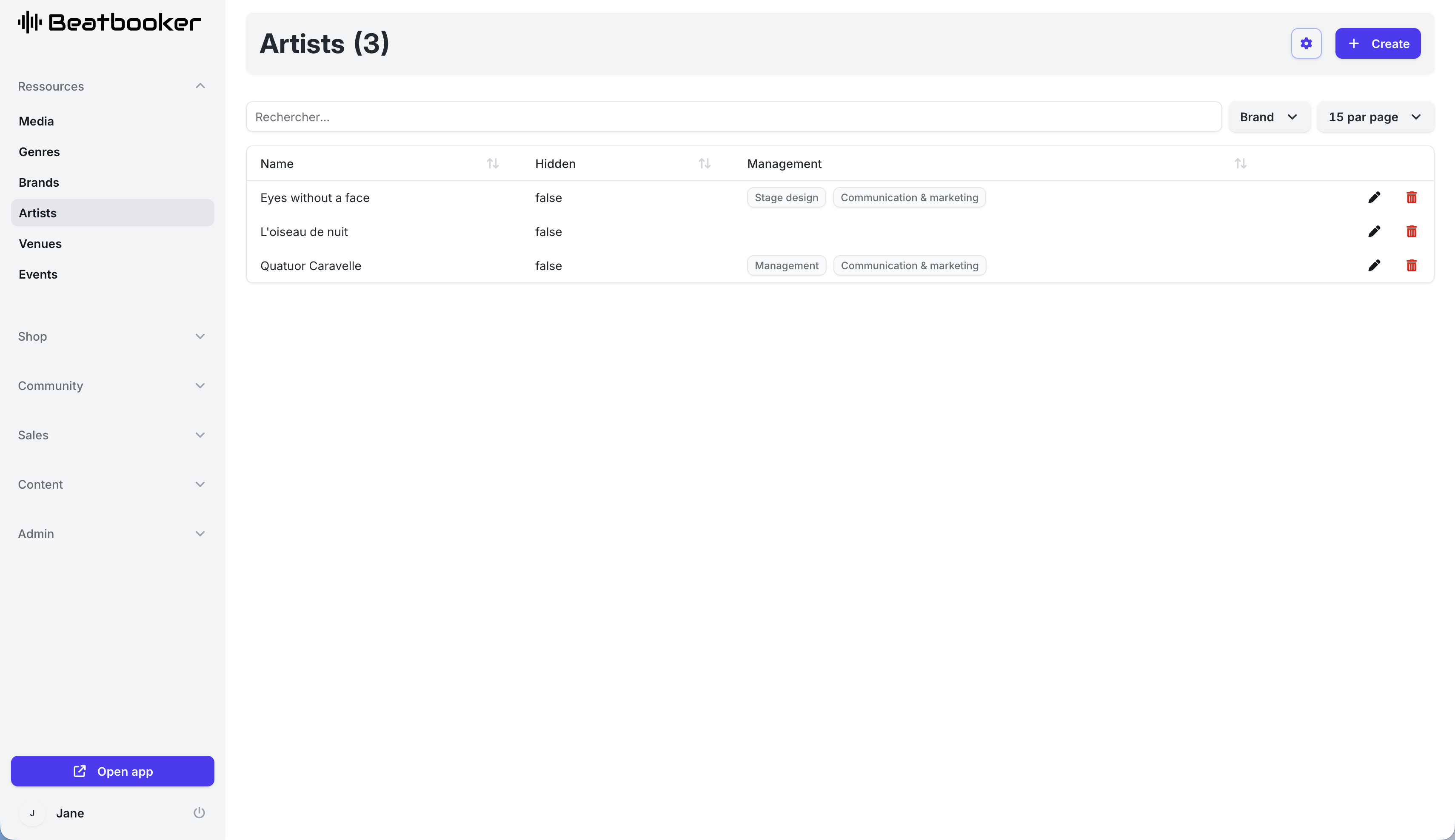 La liste affiche tous les artistes, leur visibilité et les tâches de management associées. Vous ne pouvez pas supprimer un artiste s'il est programmé dans un événement.