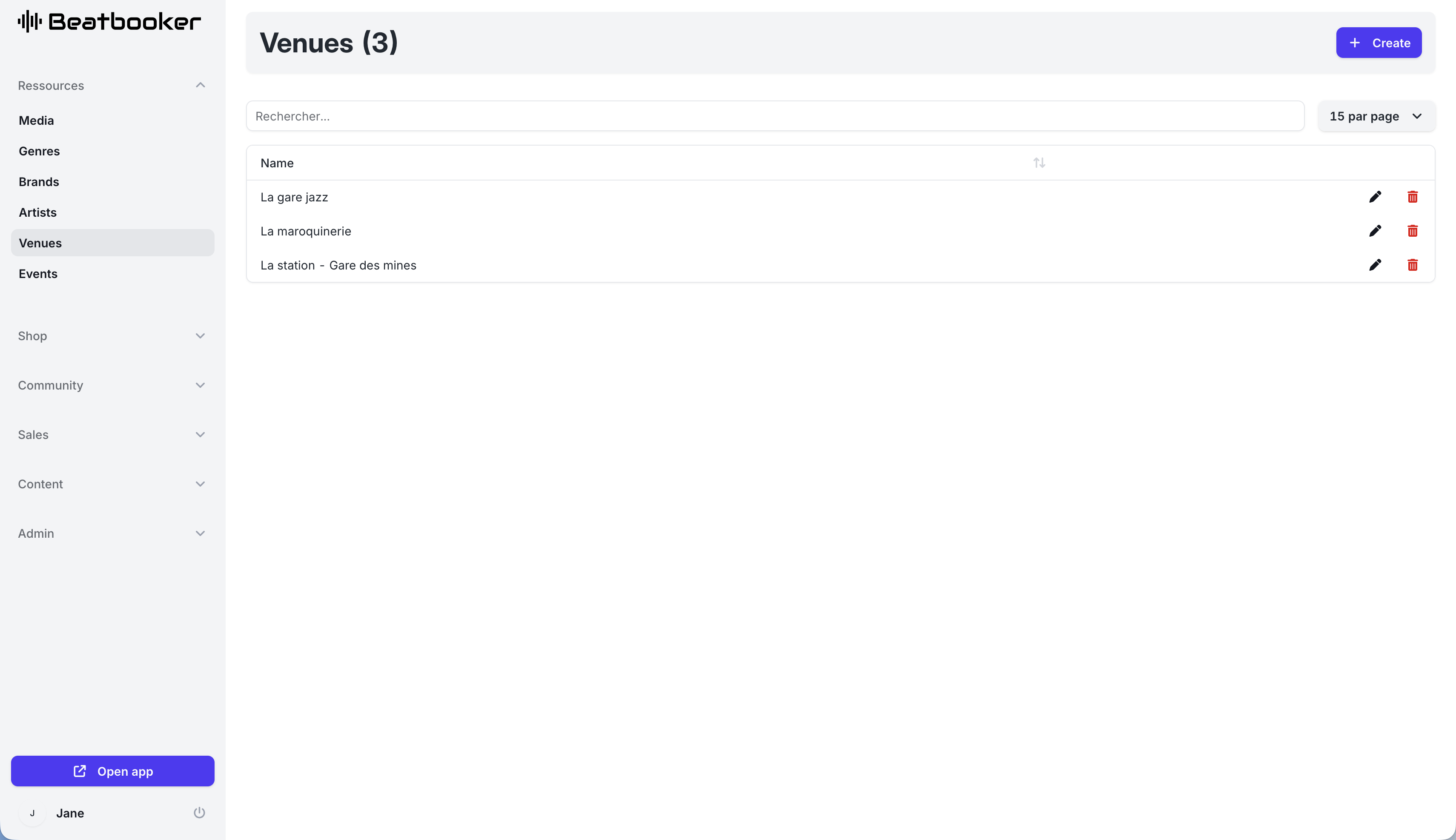 La liste affiche tous les lieux. Vous ne pouvez pas supprimer un lieu s'il accueille un événement.